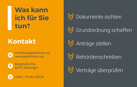 Dabei ist es egal, ob die Unterlagen vorsortiert vorliegen, in Ordnern durcheinander oder als lose Blattsammlung im Wäschekorb abgelegt sind. Der Papierfuchs kriegt das wieder hin.